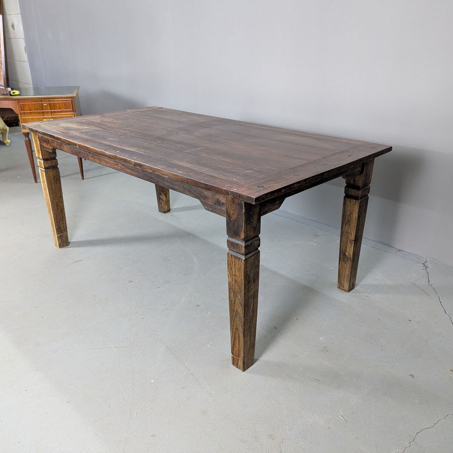 Masyvus medinis valgomojo stalas – autentiškas baldas iš natūralaus kietmedžio, pasižymintis tvirta konstrukcija ir išraiškinga medienos faktūra. Tamsiai rudos spalvos stalviršis su šiltomis natūraliomis gyslomis suteikia jaukumo, o rankų darbo apdaila bei dekoratyviniai metalo intarpai kampuose išryškina rankų darbo meistrystę. Tvirtos, kampuotos kojos su subtiliais profiliuotais elementais užtikrina stabilumą ir solidų įspūdį. Stalas puikiai tinka erdviai valgomajai zonai, kaimiško, industrinio ar vintažinio stiliaus interjerui, taip pat gali tapti pagrindiniu šeimos ar draugų susibūrimų akcentu.